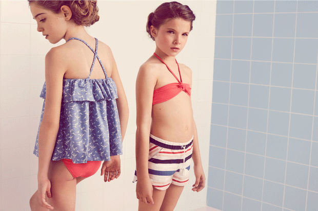 La collezione del marchio catalano, già presente nei punti vendita della catena d’abbigliamento, presenta vestiti estivi e costumi da bagno sia per i bambini che per bambine.