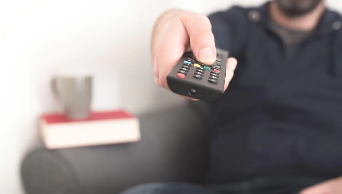 front view of person sitting on sofa using TV remote control to change channels