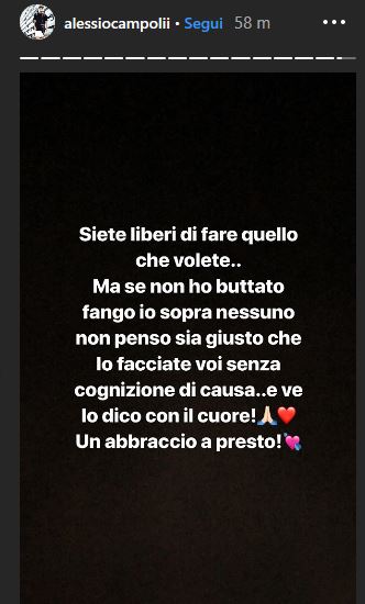La rottura tra Angela Nasti e Alessio Campoli è stata ormai ufficializzata. Dopo le parole dell’ex tronista, adesso arrivano anche quelle dell’ex corteggiatore. Il ragazzo romano, attraverso una serie di Instagram Stories ha voluto chiarire la sua posizione e chiedere ai fan di non scagliarsi contro la sua ex fidanzata, che sta perdendo follower come se non ci fosse un domani.