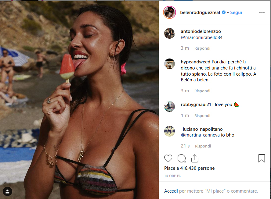 Belen è bellissima come sempre. Si tra in riva al mare, anche se non specifica dove. Indossa un bikini che lascia veramente poco spazio all’immaginazione, ma una volta tanto non è il suo corpo a far parlare il web, bensì la lingua che lecca il gelato con un pizzico di malizia. Chiaramente lei ne approfitta per far pubblicità al bikini della sua linea di costumi da bagno con un tag e ha lasciato che i followers si scatenassero con i commenti.