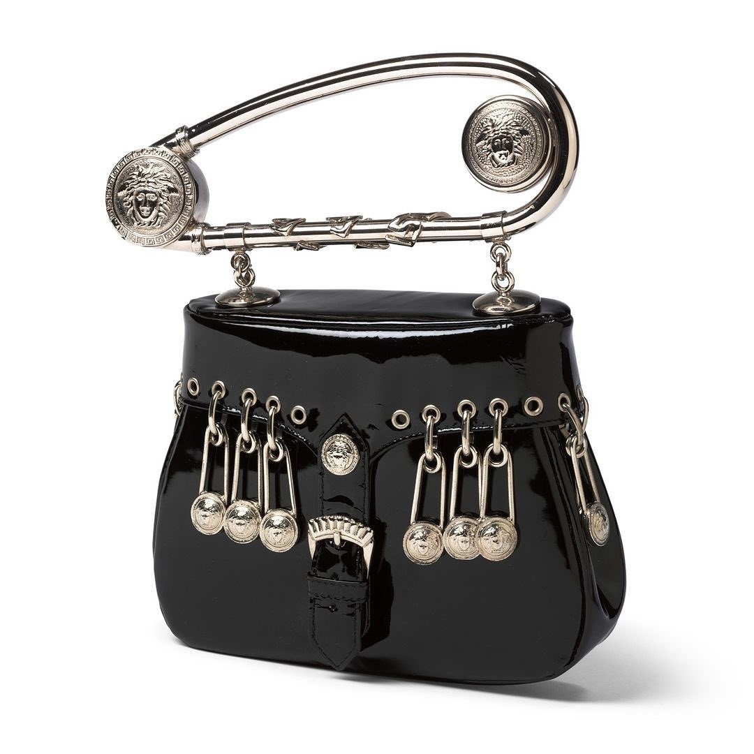 La Safety Pin ideata dallo stilista Gianni Versace nel 1994 è decorata con varie pin che recano la testa di Medusa, celebre logo del brand. Anche il manico stesso è una grande pin. Si tratta di una delle borse dal design con più personalità della storia della moda e fu presentata in occasione della sfilata per la collezione primavera/estate di quell’anno.