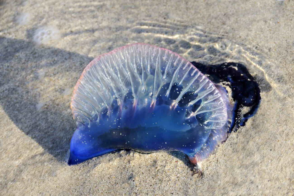 La caravella portoghese è un animale marino appartenente alla categoria dei celenterati, dei quali fanno parte meduse, coralli, idrozoi e altri organismi. L’aspetto è inconfondibile: fuori dall’acqua è ben visibile lo pneumotoforo, una sacca ricolma di gas dai colori vivaci – dal blu al violetto, passando per il rosato – che consente all’animale di galleggiare. Sotto di esso si trovano i lunghissimi tentacoli urticanti, che possono raggiungere decine di metri di lunghezza.