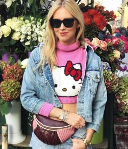 Ampi jeans molto chiari strappati in diversi punti, sneakers bianche con cuoricini rossi e una microscopica maglia di lana di Hello Kitty formano il divertente ma forse un po’ azzardato outfit milanese di Chiara.