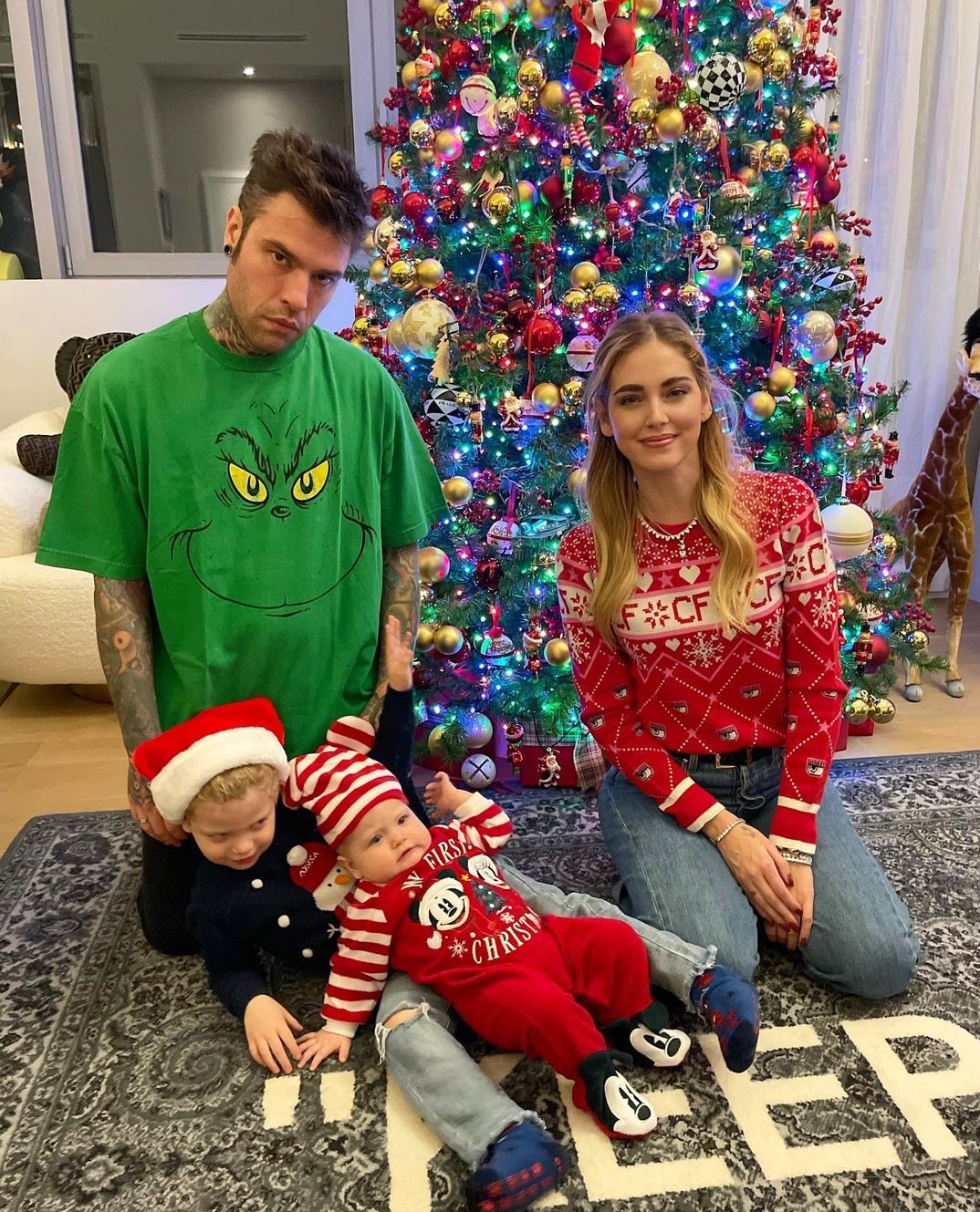 Mise natalizia per tutti (per Fedez una t-shirt del Grinch) e una foto di rito davanti all’albero, scattata in un momento di distrazione dei due piccoli di casa.