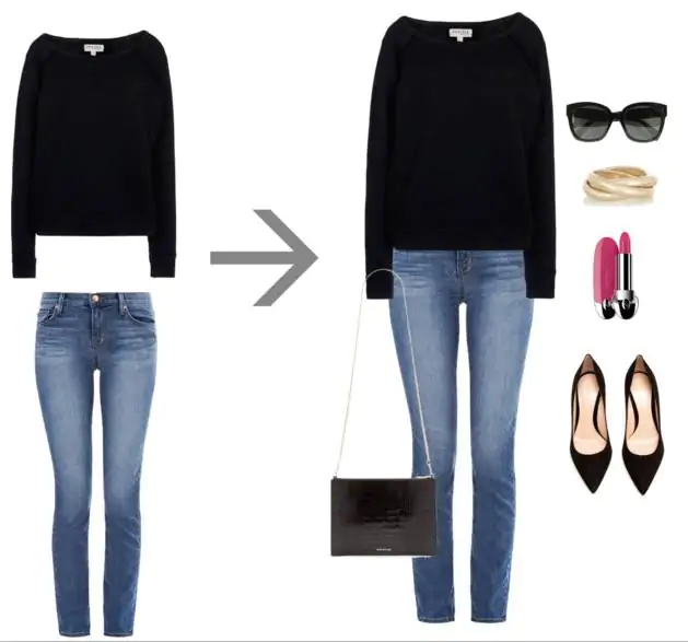 Ad esempio, è possibile prendere un abito che è semplice come una t-shirt bianca e una gonna blu navy, e renderlo interessante con un maglione fantasia.