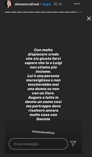“Con molto dispiacere credo che sia giusto farvi sapere che io e Luigi non stiamo più insieme. Lui è una persona meravigliosa e non toccherebbe mai una donna con un fiore. Auguro a tutte le donne un uomo così. Purtroppo devo risolvere ancora molte cose con Daniele”.