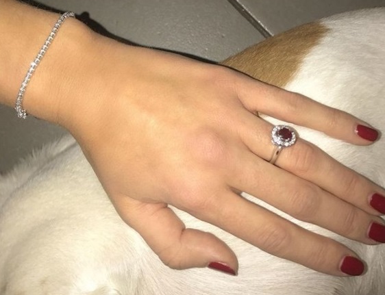 L’anello che cecilia sfoggia all’anulare della mano sinistra è formato da una pietra centrale – probabilmente un granato – circondato da piccoli diamanti.