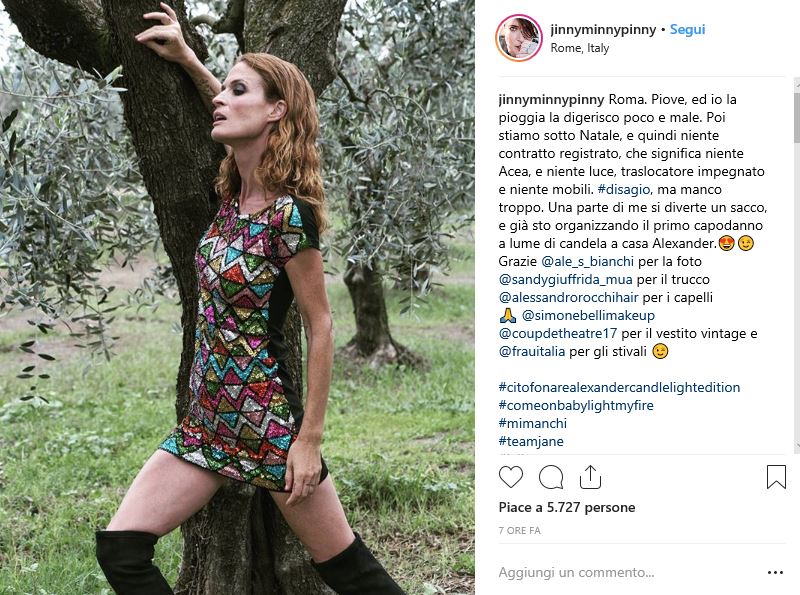 Dal suo profilo Instagram, a didascalia di uno scatto che la ritrae bella come il sole, si legge: “Roma. Piove, ed io la pioggia la digerisco poco e male. Poi stiamo sotto Natale, e quindi niente contratto registrato, che significa niente Acea, e niente luce, traslocatore impegnato e niente mobili. Disagio, ma manco troppo. Una parte di me si diverte un sacco, e già sto organizzando il primo Capodanno a lume di candela a casa Alexander”.