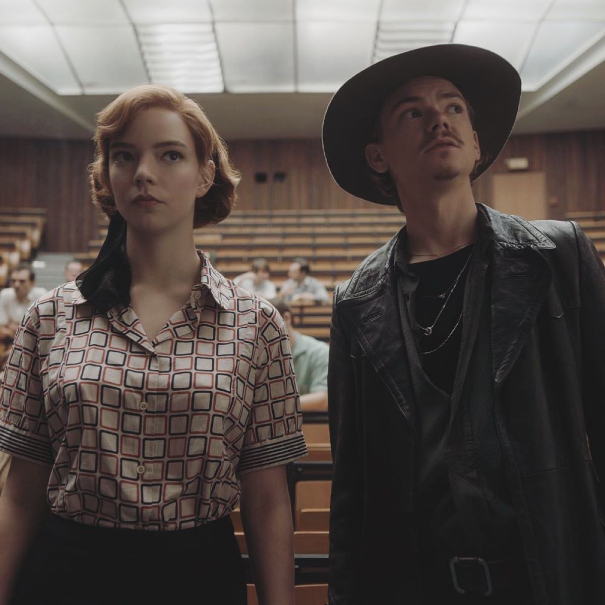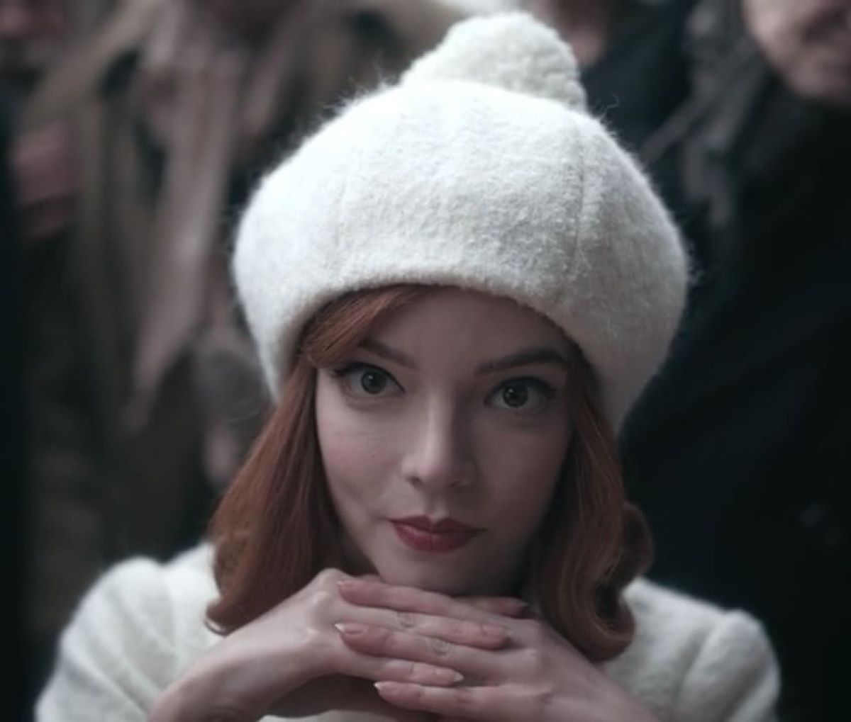 Inevitabili i riferimenti agli scacchi che si notano anche nelle stampe a quadri presenti sugli abiti, sui costumi da bagno e anche sui capispalla. Non è un caso. Gli scacchi per la protagonista sono così importanti da rappresentare molto più che un semplice gioco competitivo. Il riferimento alla scacchiera ritorna anche in chiusura della serie. Elizabeth infatti indossa un look total white composto da un cappotto in cashmere e un basco con pon pon del medesimo tessuto e colore. L’intento era quello di evocare la Regina Bianca, uno dei pezzi più importanti degli scacchi.