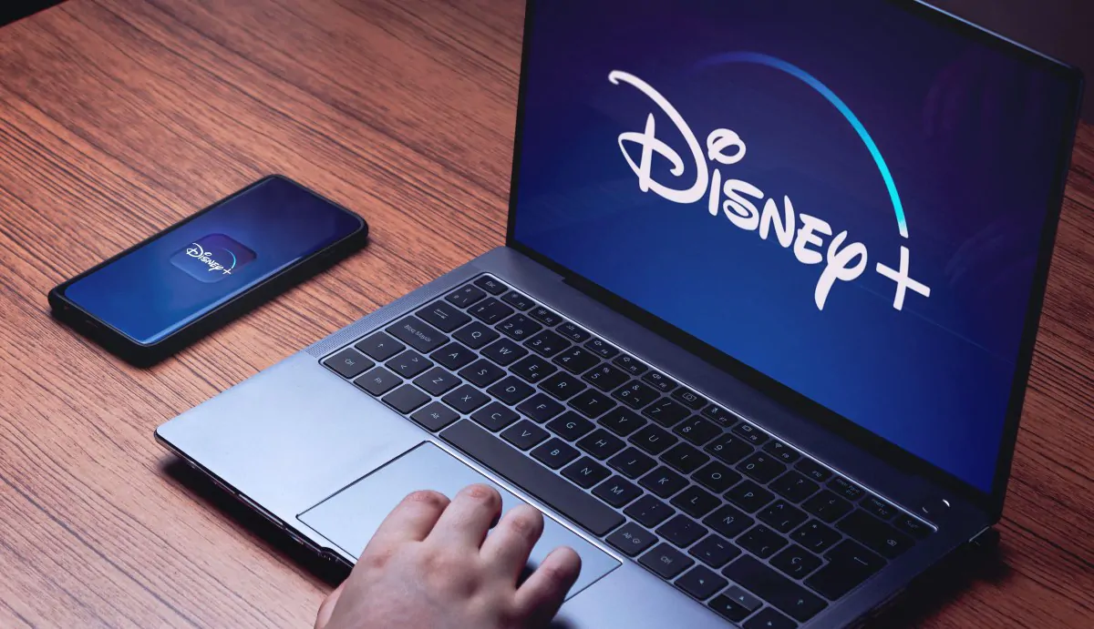 Disney+ logo on laptop and smartphone screens. Wood desk with laptop and smartphone streaming Disney+.