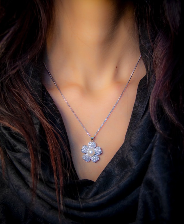 - Per chi sceglie di indossare gioielli argento non può assolutamente perdersi questa collana: un fiorellino tempestato di cristalli con una graziosa perla bianca al centro.
