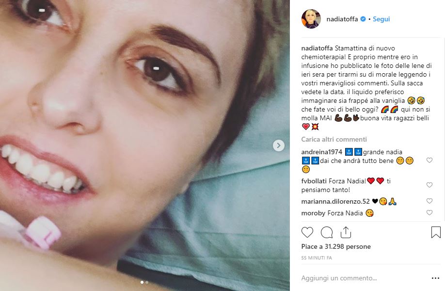 A didascalia del suo post scrive: “Stamattina di nuovo chemioterapia! E proprio mentre ero in infusione ho pubblicato le foto de Le Iene di ieri sera per tirarmi su il morale leggendo i vostri meravigliosi commenti. Sulla sacca vedete la data, il liquido preferisco immaginare che sia frappè alla vaniglia. Che fate voi di bello oggi? Qui non si molla mai! Buona vita ragazzi”. Molti dei suoi follower non avrebbero mai voluto vedere queste immagini, non perché ci sia qualcosa di sbagliato nel postarle, ma solo perché avrebbero voluto vederla stare bene.