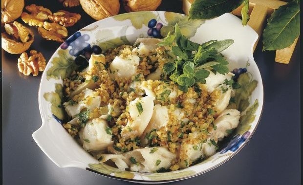 Lessare il baccalà in acqua bollente, sgocciolarlo e metterlo su un piatto da portata. Frullare i gherigli di noci con il prezzemolo e l’olio, versare questa salsa sul pesce e servire.
