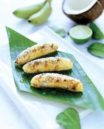 Tagliare a rondelle le banane e disporle in una pirofila imburrata. Spruzzarle con il succo di limone, spolverizzarle con lo zucchero, bagnarle con il rum e cospargerle con il cocco. Distribuire in superficie del burro a fiocchetti e cuocere in forno caldo a 220 gradi per circa 10 minuti.