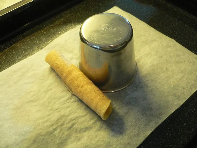 Ritirate dal forno. Staccate i biscotti con la spatola e arrotolateli a sigaretta. Quindi fateli raffreddare su una griglia.