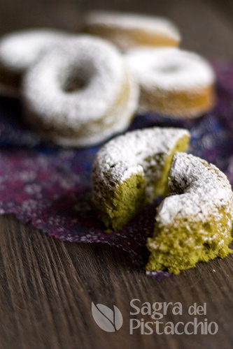 Distribuitelo sulla placca formando una quindicina di anelli di 5 centimetri di diametro. Distanziateli a sufficienza per permetterne la crescita in cottura. Cospargetene la superficie con i pistacchi tritati. Mettete in frigo per almeno 15 minuti poi passate in forno per 10-12 minuti. Lasciate intiepidire qualche minuto sulle placche prima di appoggiarle a raffreddare su una griglia. Cospargete con zucchero a velo fatto cadere da un setaccino. Conservate le ciambelline in una scatola metallica ben chiusa separando gli strati con carta oleata.