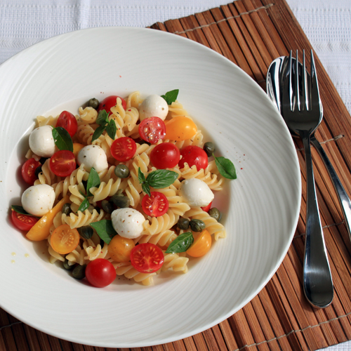 Unire la mozzarella tagliata a dadini e condire con l’aglio, l’olio, abbondante basilico e pepe. Cuocere la pasta al dente in abbondante acqua salata, versarla nella zuppiera, mescolare e lasciar riposare per 1 ora prima di servire.