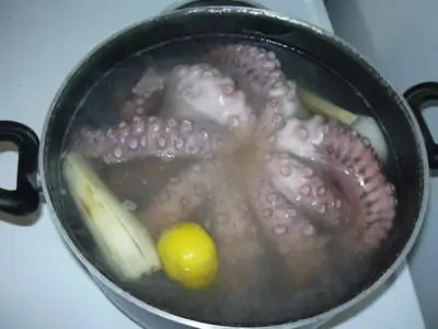 Battete bene il polipo con un bastone in modo da snervarlo, spellatelo, pulitelo e lavatelo, possibilmente con acqua di mare.In una casseruola fate bollire dell’acqua con sale, uno spicchio d’aglio e una foglia di alloro, immergetevi il polipo e dall’ebollizione calcolate circa un’ora per la cottura.