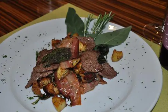 Proprio durante la cottura vengono a galla, sul grasso oramai sciolto, i pezzetti di carne. Questi, scolati con una schiumarola, si mettano a soffriggere in una padella con una cipolla precedentemente dorata. Tolti dalla padella e riposti su di un piatto, si versino sui rustei delle uova al tegame. Si contorni il tutto con polenta appena sfornata sulla basla.