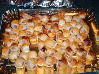Stendete la pasta sfoglia molto sottile, tagliate i wurstel a pezzi e fate dei fagottini di pasta.