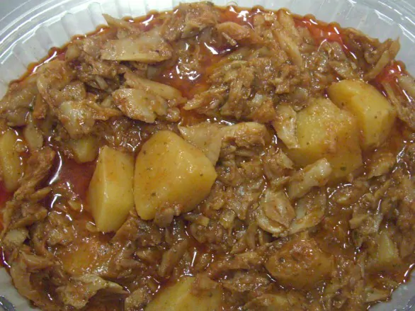 Porre in teglia lo stoccafisso tagliato a pezzi, le patate a quadrettini, la cipolla tritata, qualche pomodorino, l’olio d’oliva, una spolverata di origano 1/2 l di acqua. Salare e cuocere per 15 minuti circa. Mettere quindi nel forno caldo a 250′ per 5 minuti. Servire con abbondante prezzemolo e crostini di pane.