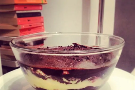 Mettete nel mortaio gli amaretti e pestateli, poi uniteli alla crema di cioccolata. In una ciotola larga e bassa precedentemente bagnata (fondo e pareti) di marsala, preparate uno strato di savoiardi che andrete via via intingendo per un solo attimo (perché non s’inzuppino troppo) nel marsala allungato con un poco di latte o d’acqua. Stendete su questi uno strato di crema, un altro inzuppato di biscotti e procedete fino ad aver esaurito tutti gli ingredienti.