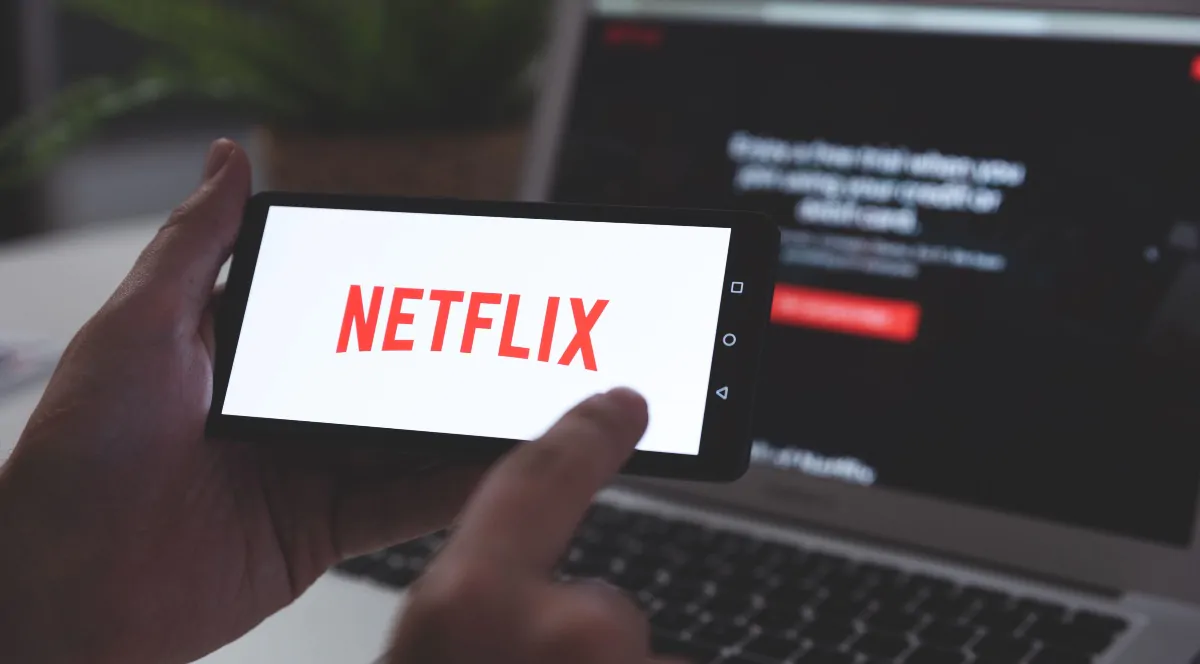 Wroclaw, Poland - OCT 23, 2019: Man with Netflix logo on screen. Netflix is most popular video streaming platform.
