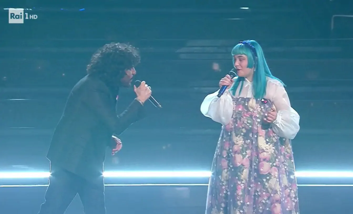 Random e The Kolors si sono esibiti sulle note di Ragazzo fortunato. Il cantante in gara a Sanremo 2021 ha sfoggiato un look agghiacciante.
