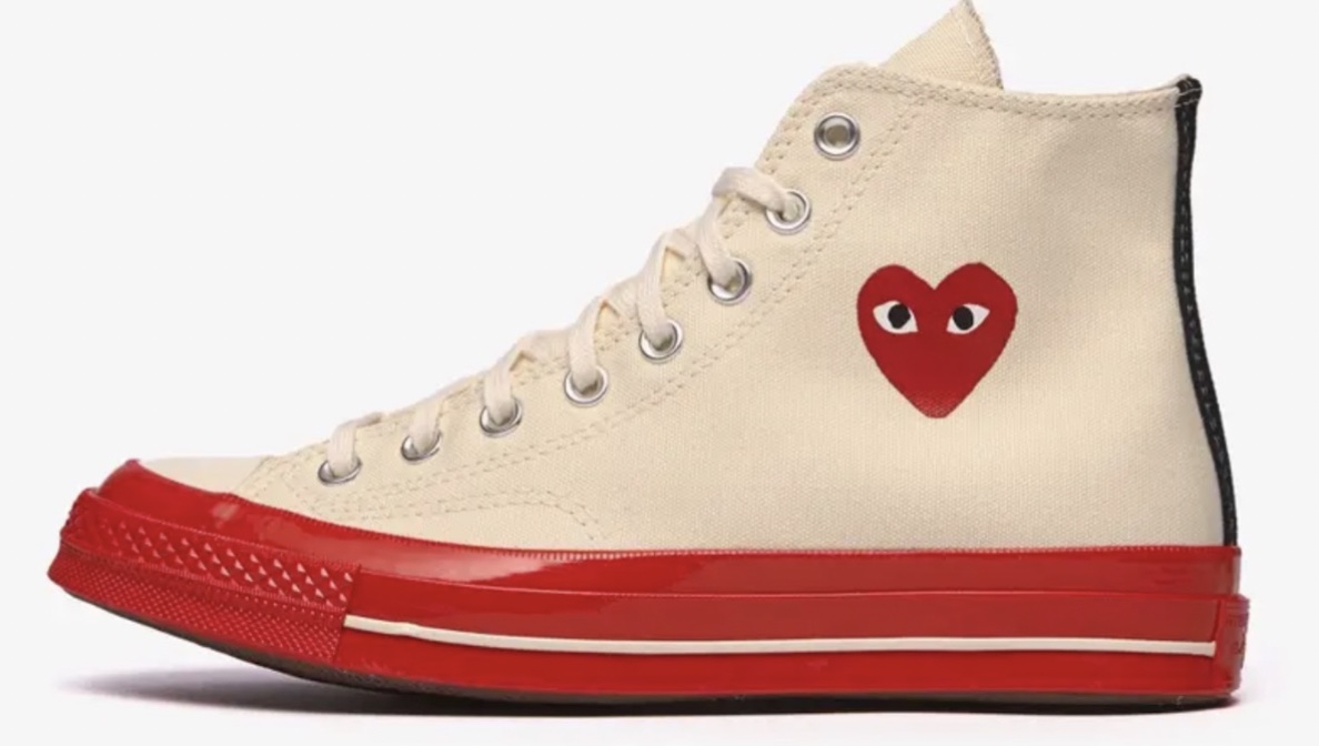 - Comme des Garçons Play Chuck 70 HI “Red Sole” x Converse: Converse collabora ancora una volta con Come des Garçons Play, per riportare l’iconico cuore con due occhi sui modelli più classici del brand. Questo modello ha un taglio alto in tela bianca, contrastata da una suola rossa brillante, con il cuore di Filip Pagowski;
