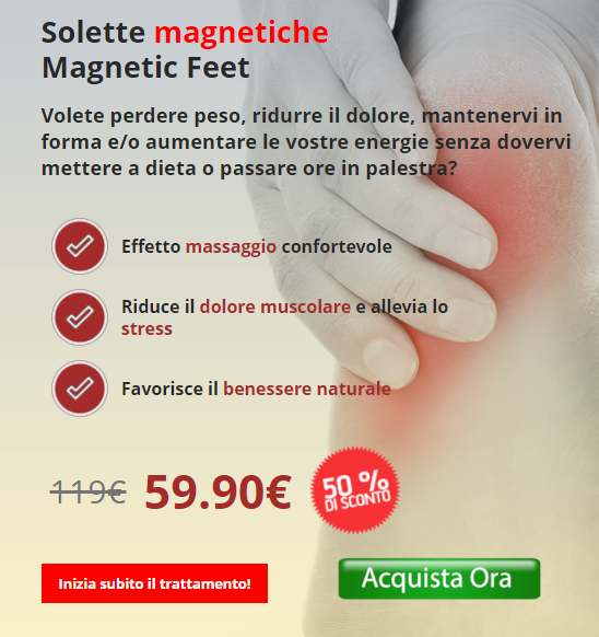Hanno un effetto massaggiante che dona comfort, riducono il dolore muscolare alleviando lo stress e garantiscono un benessere totale e in armonia con il corpo. Le solette magnetiche di Magnetic Feet si caratterizzano per una sporgenza massaggiante che garantisce una pressione che è costante in ogni punto. Sono considerate le migliori solette magnetiche perché funzionano davvero rispetto alle altre presenti sul mercato. Per chi volesse saperne di più. può cliccare qui o sulla seguente immagine