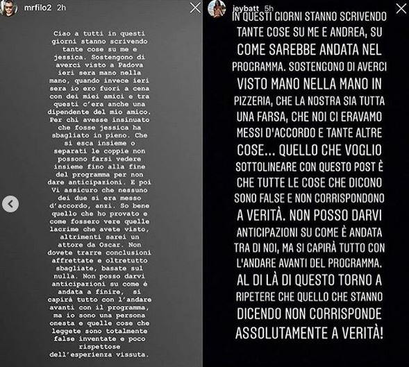 La replica scritta da Andrea Filomena è molto simile a quello della fidanzata. Immaginiamo che entrambi, prima di interevenire sui social, abbiano chiesto il permesso alla produzione di Temptation Island, anche perché, per contratto, non possono rivelare nulla del programma fino a quando non sarà andata in onda l’ultima puntata. Andrea ha scritto: “Ciao a tutti. In questi giorni stanno scrivendo tante cose su me e Jessica. Sostengono di averci visto a Padova ieri sera mano nella mano, quando invece ieri sera io ero fuori con dei miei amici e tra questi c’era anche un dipendente di un mio amico. Per chi avesse insinuato che fosse Jessica ha sbagliato in pieno. Che si esca insieme o separati le coppie non possono farsi vedere fino alla fine del programma per non dare anticipazioni. E poi vi assicuro che nessuno dei due si era messo d’accordo, anzi. So bene quello che ho provato e come fossero vere le lacrime che avete visto, altrimenti sarei un attore da Oscar. Non dovete trarre conclusioni affrettate e oltretutto sbagliate basate sul nulla. Non posso darvi anticipazioni su come è andata a finire. Si capirà tutto con l’andare avanti del programma ma io sono una persona onesta e quelle cose che leggete sono completamente false, inventate e poco rispettose dell’esperienza vissuta”. Insomma, quanti sostenevano che Andrea e Jessica fossero d’accordo e che si fossero mostrati insieme hanno toppato alla grande. Quello che è successo con loro, ovvero la diffusione di false notizie, accade ogni anno a Temptation Island, quindi non c’è da meravigliarsi. D’altronde, i social pullulano di fake news, quindi dovremmo ormai averci fatto il callo.