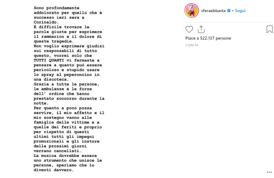 Sfera Ebbasta, attraverso i suoi profili social ha voluto commentare quanto avvenuto e le sue parole non sono solo commoventi, ma vogliono anche lanciare un importante messaggio: “Sono profondamente addolorato per quello che è successo ieri sera a Corinaldo. È difficile trovare le parole giuste per esprimere il rammarico e il dolore di queste tragedie. Non voglio esprimere giudizi sui responsabili di tutto questo, vorrei solo che TUTTI QUANTI vi fermaste a pensare a quanto può essere pericoloso e stupido usare lo spray al peperoncino in una discoteca. Grazie a tutte le persone, le ambulanze e le forze dell’ordine che hanno prestato soccorso durante la notte. Per quanto a poco possa servire, il mio affetto e il mio sostegno vanno alle famiglie delle vittime e a quelle dei feriti e proprio per rispetto di questi utlimi, tutti gli impegni promozionali e gli instore dei prossimi giorni verranno cancellati. La musica dovrebbe essere uno strumento che unisce le persone, speriamo che lo diventi davvero”. Quello che è successo al concerto di Sfera Ebbasta ha sconvolto tutta Italia, nessuno escluso. Sei persone sono morte per colpa di un gesto di qualche folle, che mi auguro si costituisca ammettendo e pagando per le proprie colpe. Sfera Ebbasta non poteva fare altro che annullare tutti gli eventi in programma per i prossimi giorni: lo deve ai suoi fan che hanno trovato la morte ad un suo concerto. Speriamo solo che cose del genere non avvengano più.