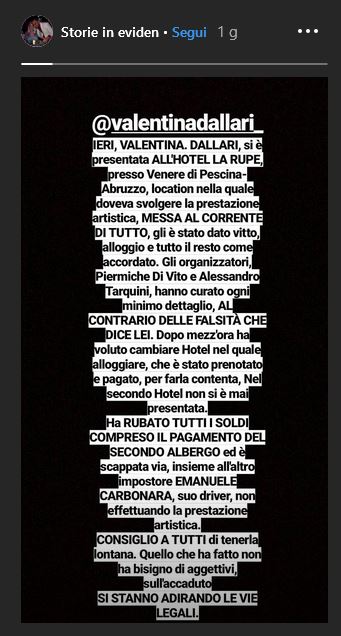 Dopo che la serata è saltata ha pubblicamete accusato Valentina di furto. Attraverso una serie di Instagram Stories ha scritto: “Valentina Dallari si è presentata all’hotel La Rupe presso Venere di Pescina, in Abruzzo, location presso la quale doveva svolgere la prestazione artistica. Lei è stata messa al corrente di tutto, le è stato dato vitto, alloggio e tutto il resto come accordato. Dopo mezz’ora ha voluto cambiare hotel nel quale alloggiare, che è stato prenotato e pagato, per farla contenta. Nel secondo hotel non si è mai presentata. Ha rubato tutti i soldi, compreso il pagamento del secondo albergo ed è scappata via insieme all’altro impostore, suo driver, non effettuando la prestazione artistica. Consiglio a tutti di tenerla lontana. Quello che ha fatto non ha bisogno di aggettivi. Sull’accaduto si stanno avviando le vie legali”. Possibile che la Dallari si sia macchiata di un furto tanto stupido? Di certo Valentina fornirà ulteriori spiegazioni perché sembra davvero impossibile che sia scappata con il ‘malloppo’ senza un motivo serio alla base. Attendiamo sviluppi.